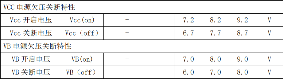 - VCC:开启 8.2V,关断 7.7V(典型)