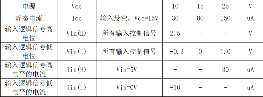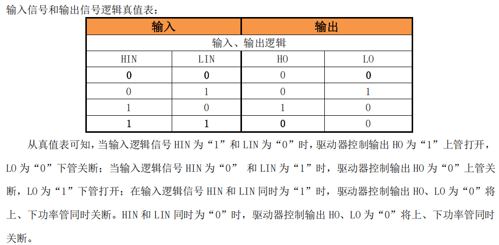 - 双路逻辑输入(HIN, LIN):兼容3.3V/5V,高电平阈值 >2.5V,低电平阈值 <1.0V,均内置200kΩ下拉电阻