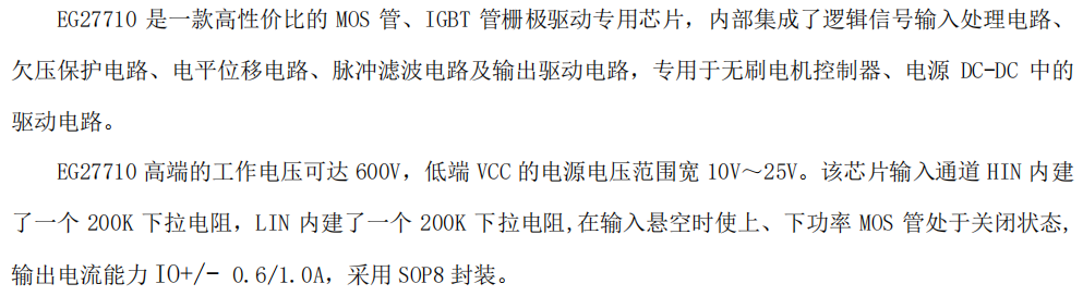 - 引脚定义与EG2106D完全兼容:Pin1=VCC, Pin2=HIN, Pin3=LIN,Pin4=GND。这使得EG27710可以作为EG2106D的高性能直接替换升级选项,无需修改PCB。