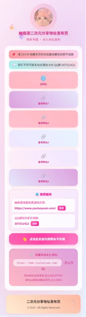 这款二次元风格的地址发布页源码,不仅外观可爱,功能也十分实用,非常适合用于个人资源站点、社群分享页或作为防失联工具。作为幽络源持续更新的优质内容之一,我们始终致力于为开发者和爱好者提供高质量的免费源码与技术支持。