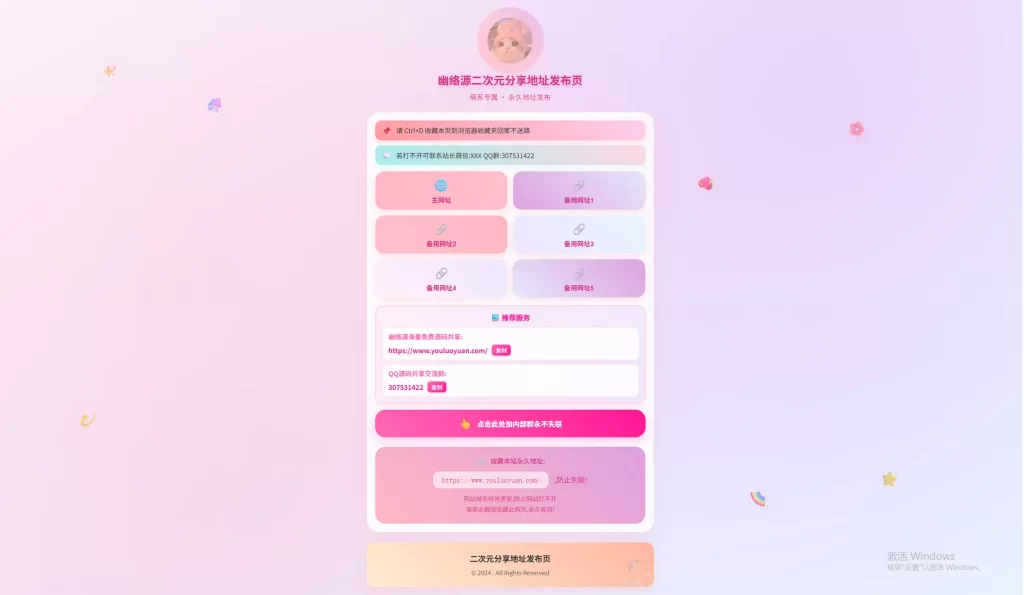 这是一款专为二次元爱好者设计的地址发布页面,采用清新可爱的萌系风格,整体以粉紫色调为主,搭配浮动装饰元素和渐变背景,营造出轻松愉悦的视觉体验。页面不仅美观,还具备强大的实用性,支持主网址与5个备用网址入口,确保用户在任何情况下都能稳定访问目标服务。