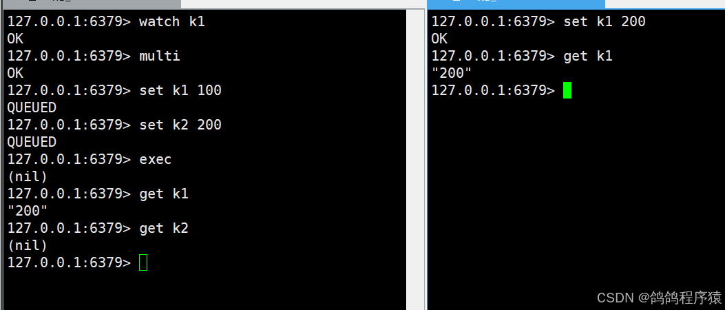 真正执⾏修改操作, 此时对⽐版本发现, 客⼾端的 k1 的版本号是 0, 服务器上的版本号是 1, 版本不⼀致! 说明有其他客⼾端在事务中间修改了 k1 ,事务提交失败,这次提交的所有命令都没有执⾏。
