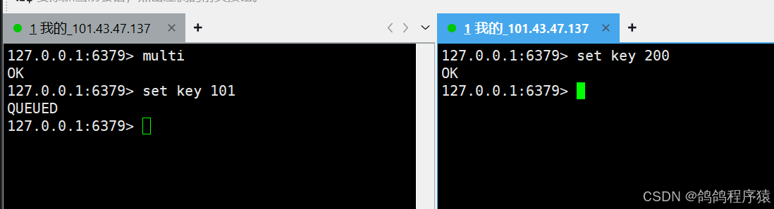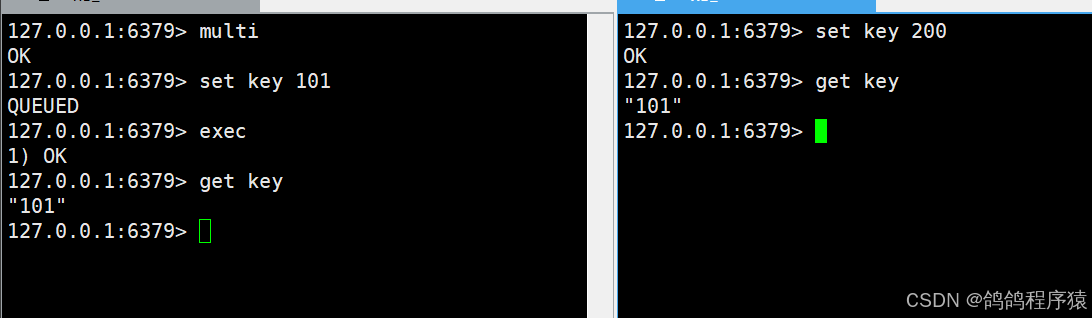 从时间上看,事务执行其实是在客户端2设置200的后面执行的,得到101的结果是没问题的,这就是没保证隔离性产生的问题,watch 命令就是⽤来解决这个问题的。