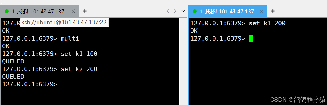 每次添加⼀个操作,都会提⽰ "QUEUED",说明命令已经进⼊客⼾端的队列了。真正执⾏ exec 的时候,客⼾端才会真正把上述操作发送给服务器。此时就可以获取到上述 key 的值了.