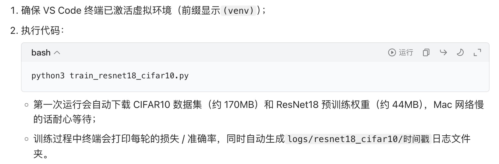 如果训练中遇到 "内存不足"(Mac 内存 8G 以下),可将BATCH_SIZE改为 32;若验证准确率低,可增加训练轮数到 15,或解冻 ResNet18 的最后 1-2 层特征层(代码中取消部分层的冻结)。