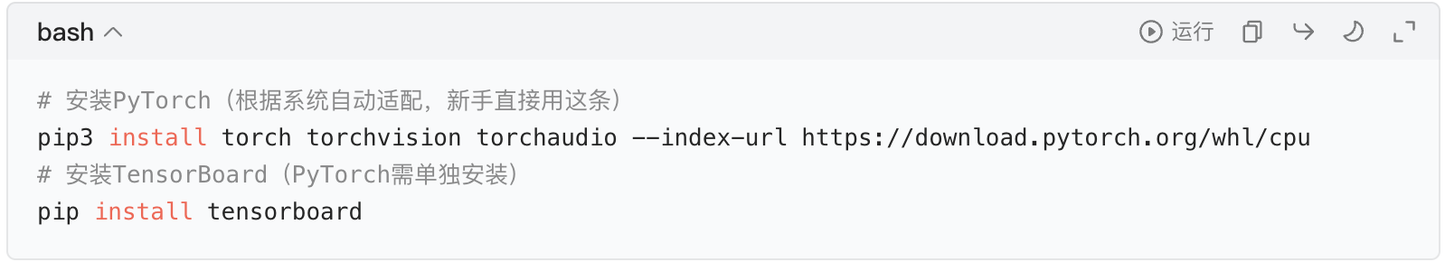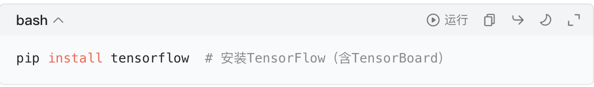 pip install tensorflow # 安装TensorFlow(含TensorBoard)