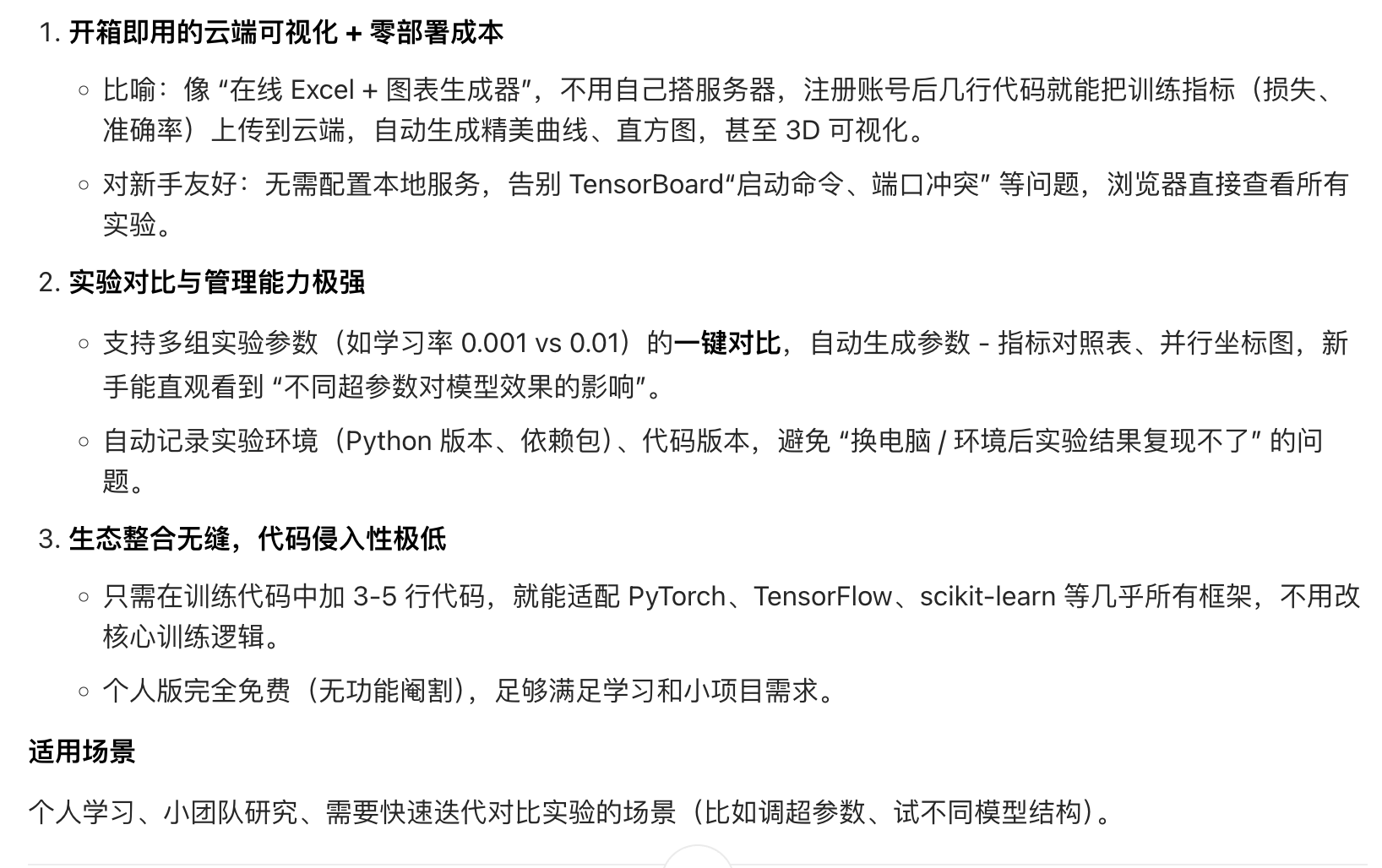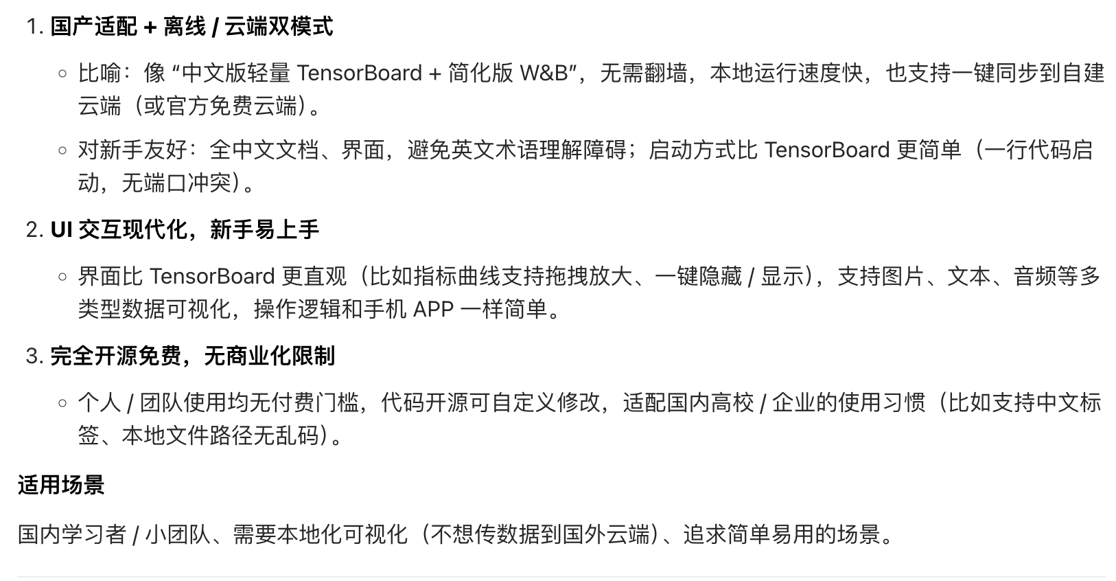 - 网页展示:打开浏览器,就能看到可视化的指标曲线、模型结构图等(类似看仪表盘)。