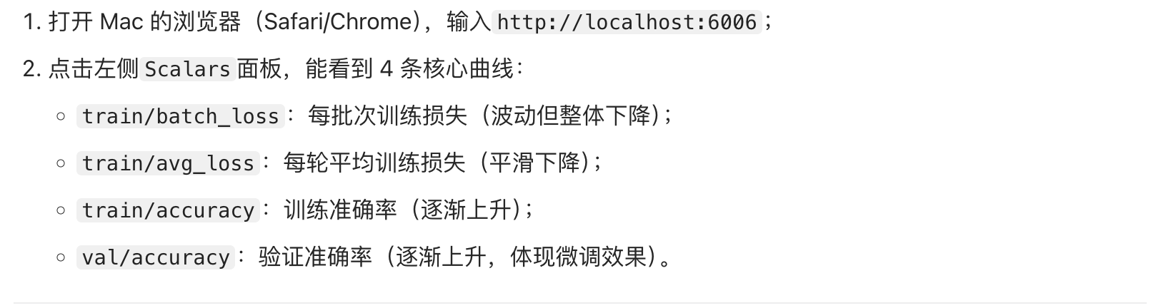 - TensorBoard 监控核心:写入批次 / 轮级损失 / 准确率,通过曲线判断微调效果(验证准确率上升 = 微调成功)。