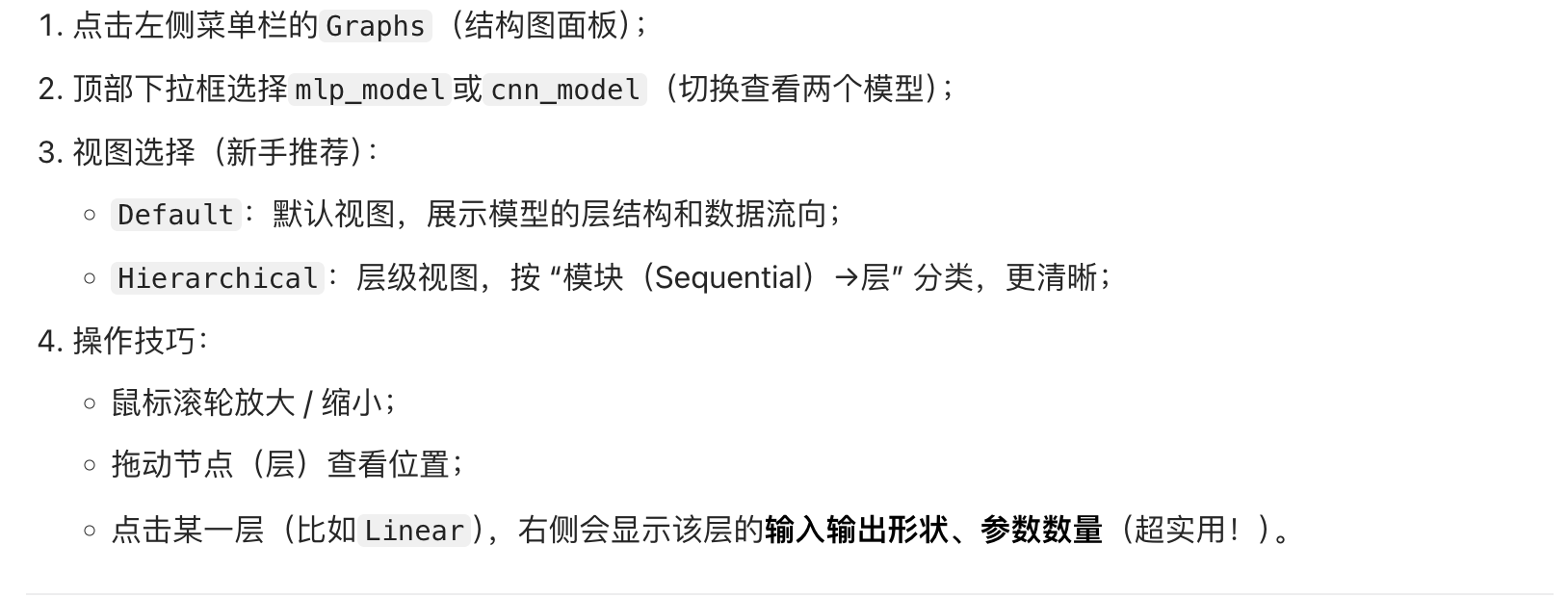 | Graphs | 看模型的结构图(比如神经网络的层) | 检查模型结构是否正确 |