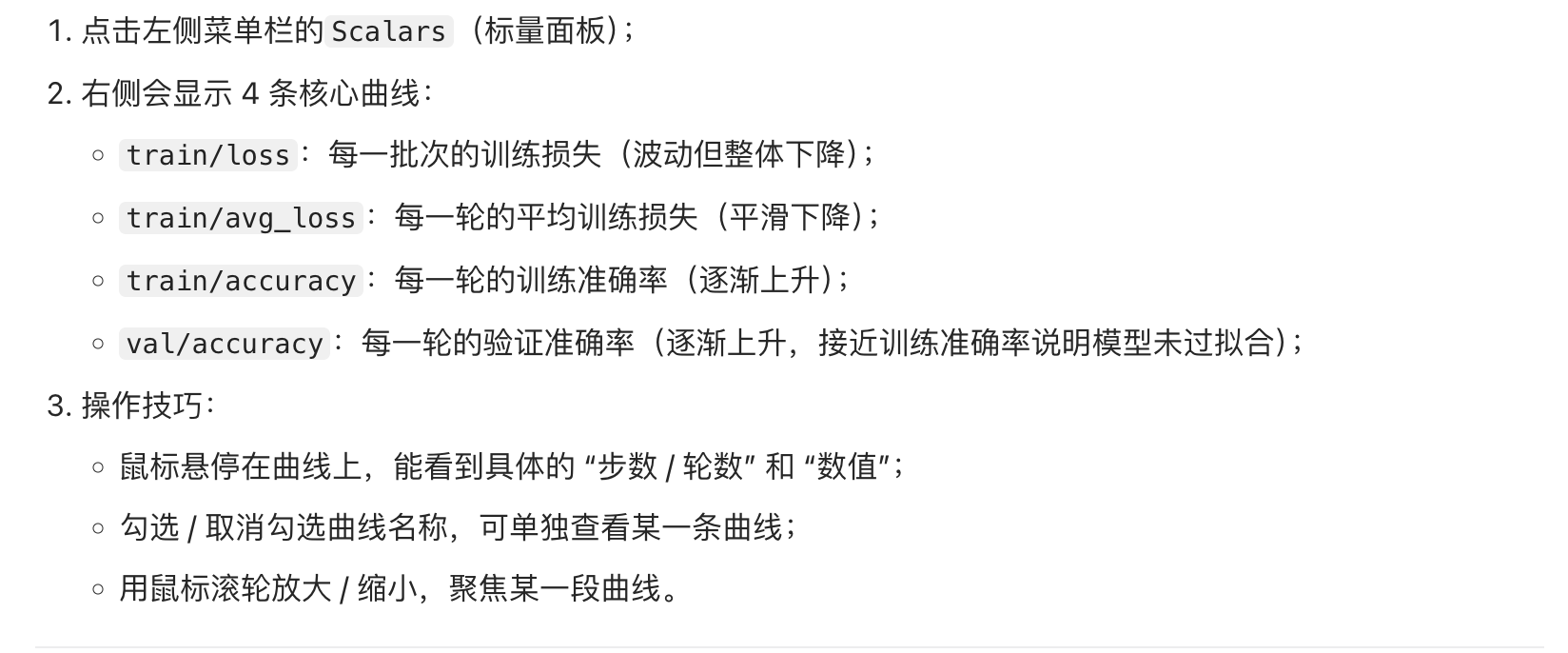 | Scalars | 看数值变化曲线(比如损失、准确率) | 训练过程监控(必用) |