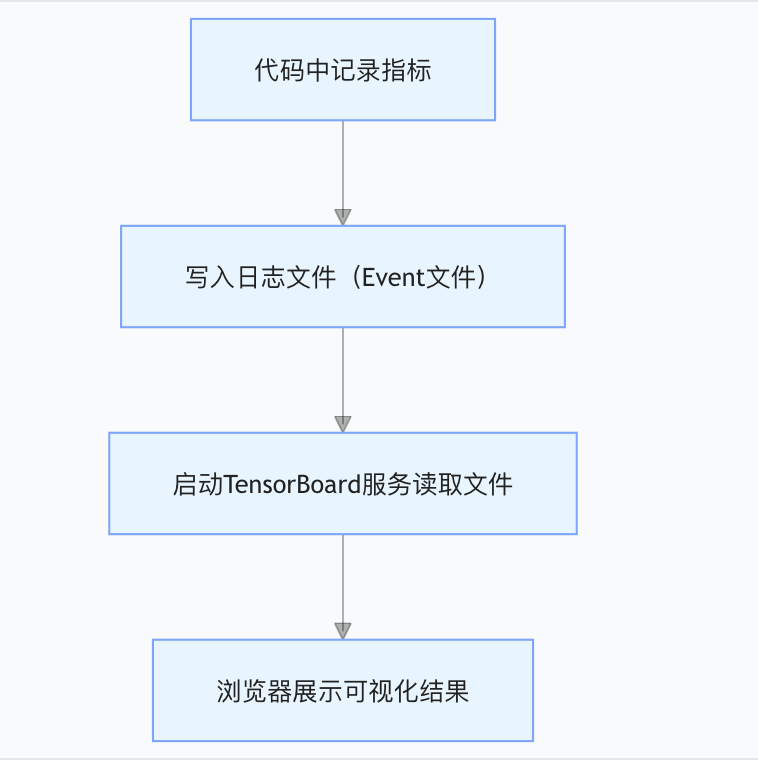 - 数据写入:在训练代码里,告诉 TensorBoard "要记录哪些指标"(比如每步的损失、准确率),这些数据会被保存到指定文件夹的 "Event 文件" 里(类似熬汤时记的 "烹饪日志");