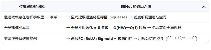 🌟 "先对空间维度做'全局平均'压缩,得到每个通道的'摘要统计量';再用一个小网络学习这些摘要之间的非线性关系;最后用学到的权重反哺原特征------就像给神经网络装了一个'自适应通道调音台'。"