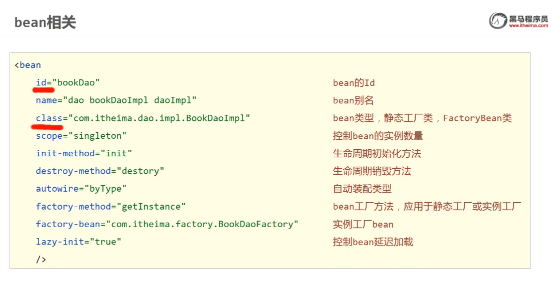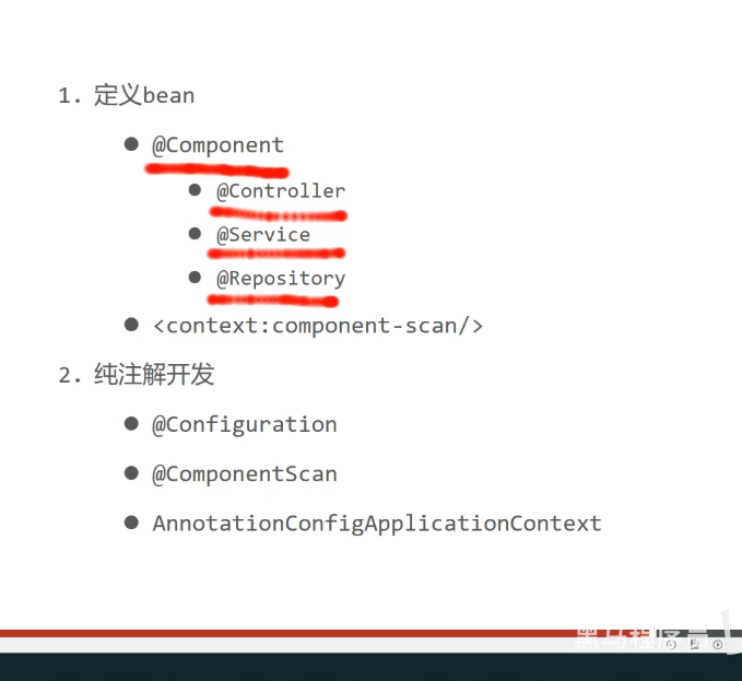 | 定义bean | bean标签 id属性 class属性 | @Component @Controller @Service @Repository @ComponentScan |