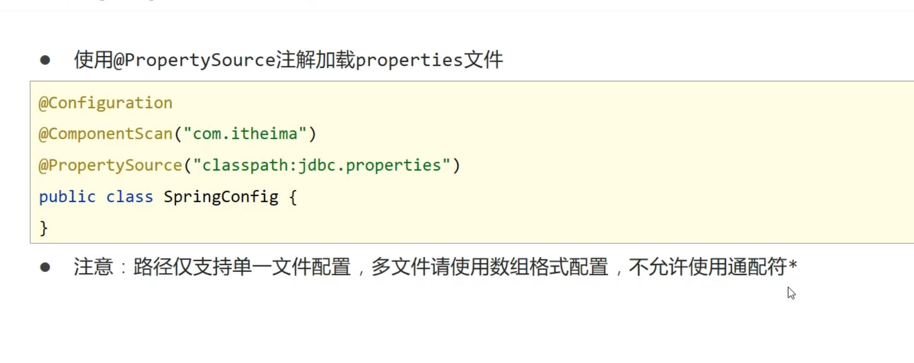 @PropertySource("配置文件的名字") //这里不支持使用通配符