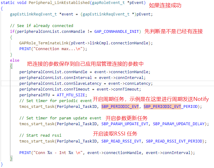 GAPROLE_CONNECTED状态,同时为了确保确实是 BLE 物理连接已经成功建立,判断一下是否为GAP_LINK_ESTABLISHED_EVENT事件,如果是就表示建立连接,执行下面函数操作然后打印Connected..\n:
