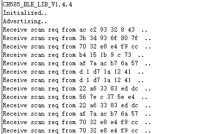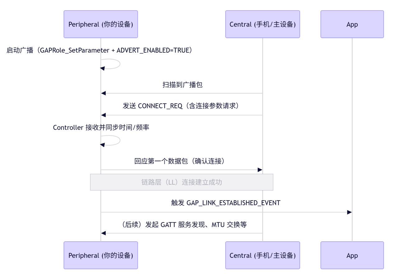 GAPROLE_ADVERT_ENABLED为TRUE(即便没写默认也是TRUE) ,所以设备就自动开启广播,进入GAPROLE_ADVERTISING状态,打印Advertising..\n。如果没有设备连接,会按照自己设置的广播周期,一直处于这种状态。