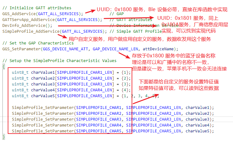 再往下就是注册 GATT 服务了,说直白点,就是那些带有 UUID 的服务特征值,蓝牙数据的交互就是读写特征值。