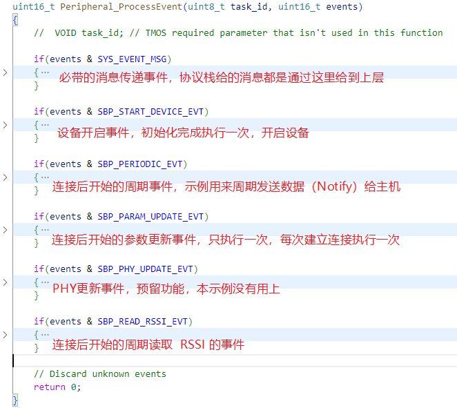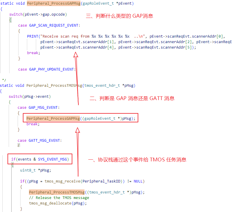这个地方的流程,有必要说明一下,防止小伙伴理不清,首先我们知道 蓝牙有 GAP 层和 GATT 层,在我们蓝牙设备开始工作以后,Ble 协议栈会自动的向我们应用层主动发送事件通知,我们应用层就是根据不同的事件进行应用处理的。( TMOS 会固定有一个消息传递事件,开启设备的时候已经告诉了协议栈我设备用的是哪一个 TMOS 任务)