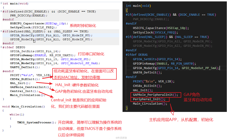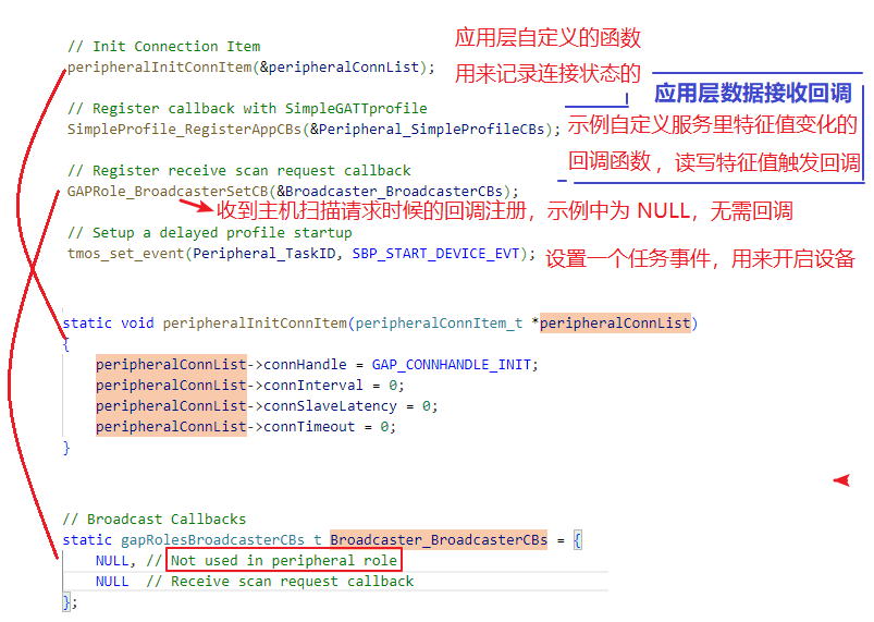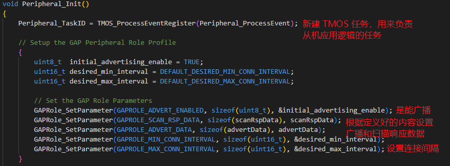 我们从从机初始化函数 Peripheral_Init() 开始看起,这里呢我就不直接贴出官方代码占用篇幅了,大家都能从官网下载,真的想学习肯定是要下载官方 EVT 对着源码看,而且我在说明中也会有源码截图。