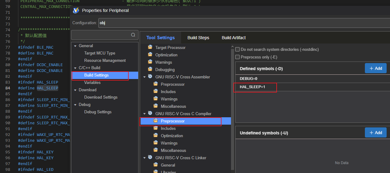 蓝牙 MAC 地址,发射功率,开启睡眠,RTC选择等等。需要说明一下,如果想要修改宏定义,建议统一在 MounRiver Studio 中配置而不是手动修改 CONFIG.h 文件,比如:
