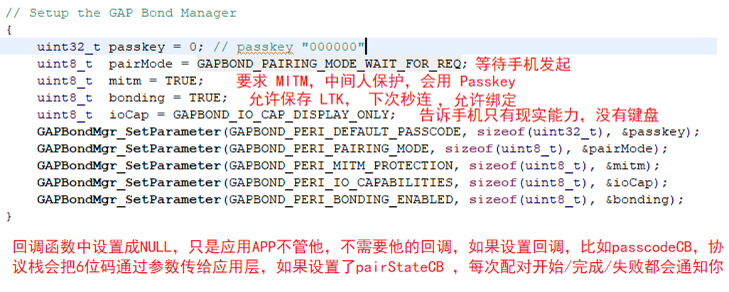 通过上面说明,我们知道了,在初始化完成以后,立即就开起了设备,在开启设备的库函数中,我们怕设置好了我们的回调函数。其中,RSSI 读取的回调函数 和 参数更新的回调函数都很简单,我们也很好理解: