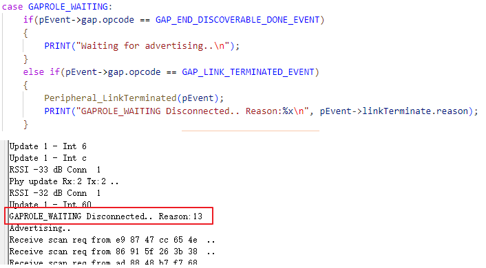GAPROLE_WAITING状态,然后根据不同的事件打印不同效果,对于示例而言,不会自动停止广播,所以不会进入GAP_END_DISCOVERABLE_DONE_EVENT事件分支,最常见的就是 BLE 连接已经断开 的GAP_LINK_TERMINATED_EVENT分支,立即执行下面函数,然后打印Disconnected.. Reason::