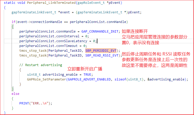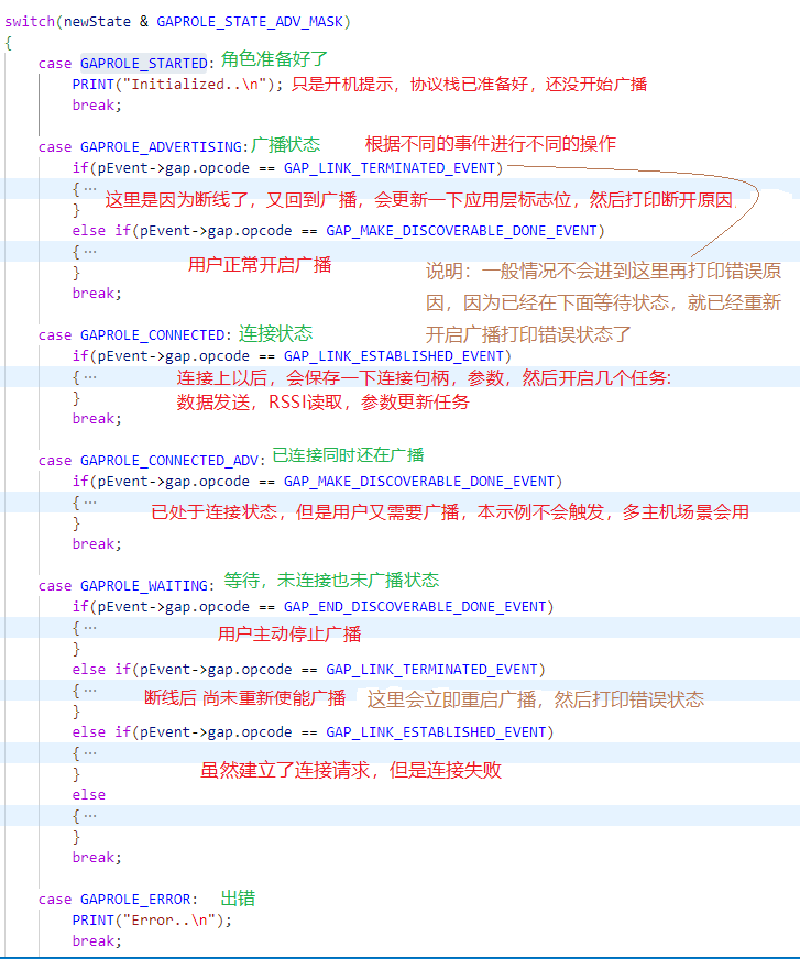 在示例中,可以看到有两处打印错误原因的地方,但是实际上,都是生效的GAPROLE_WAITING 中的打印,在这里面重新开启广播,再进入 GAPROLE_ADVERTISING:
