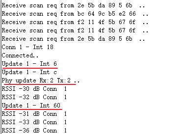 上面的 PHY 更新事件,是从机想向主机发起 PHY 请求时候可以使用的,本示例并没有用到这个事件。我们在测试示例的时候会发现有 Phy update Rx:2 Tx:2 .. 此类的打印,这个是主机连接后会发起 PHY 更新请求导致的打印。