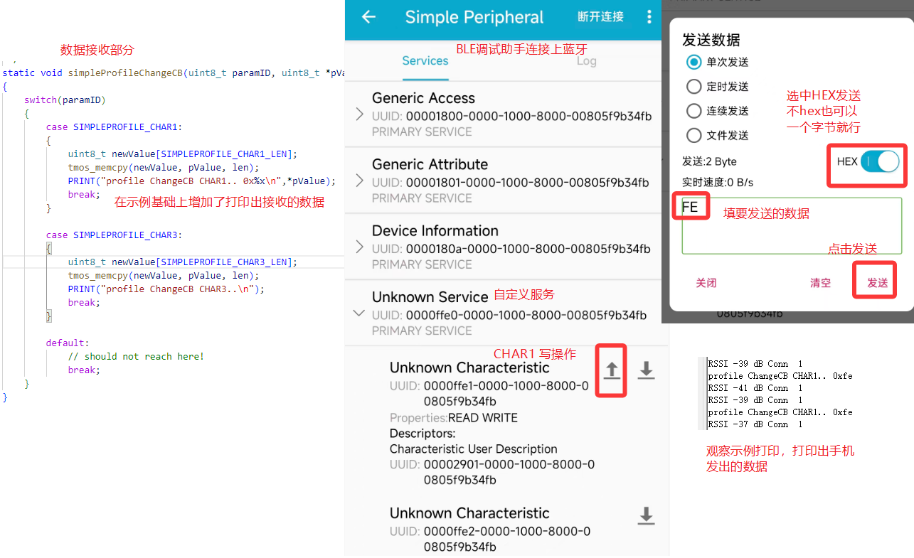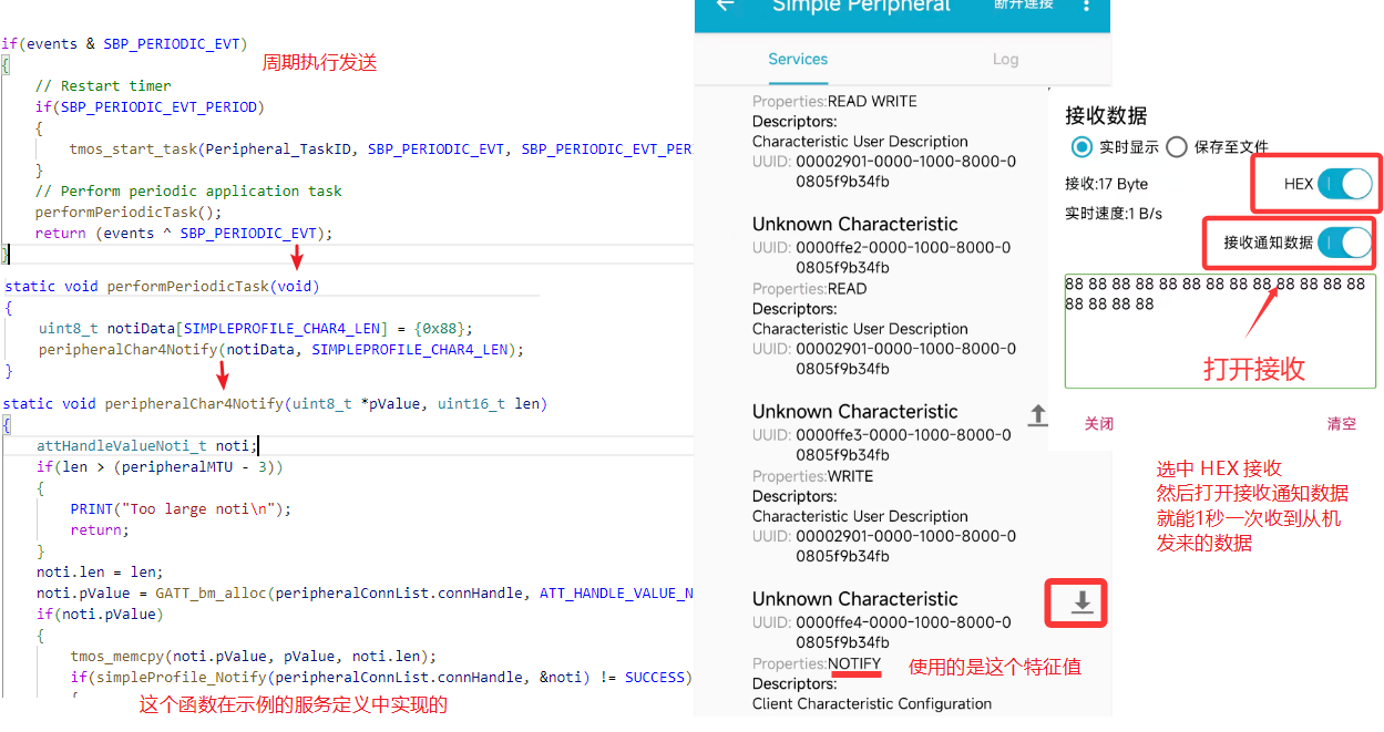一个是周期发送通过自定义特征值发送 Notify,主机开启接收就会一直收到来自从机的 Notify(数据)。