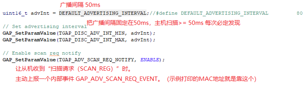首先是配置从机广播内容、广播开关、以及连接参数,如下: