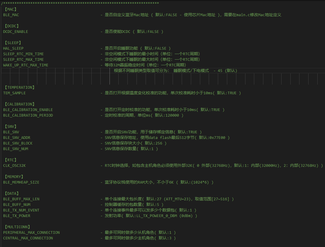 开头的初始化 CH58x_BLEInit(); HAL_Init(); 主机和从机是一样的,在CH58x_BLEInit 里面确定 MAC 地址 和 发射功率,他们都与宏定义有关,这些配置宏定义都存在于CONFIG.h 文件中。