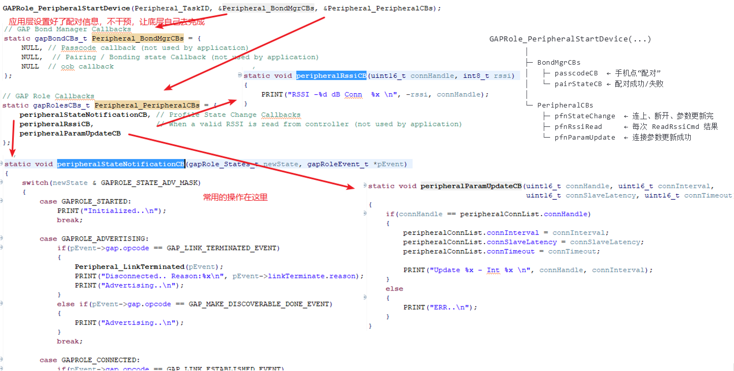 使用库函数GAPRole_PeripheralStartDevice 开启设备,配置回调函数: