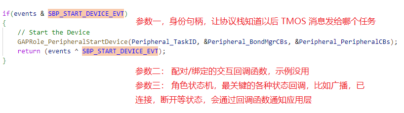 初始化完毕,进入 TMOS 调度,直接就执行 SBP_START_DEVICE_EVT 事件,这个事件是个一次性的事件,功能就是开启设备。