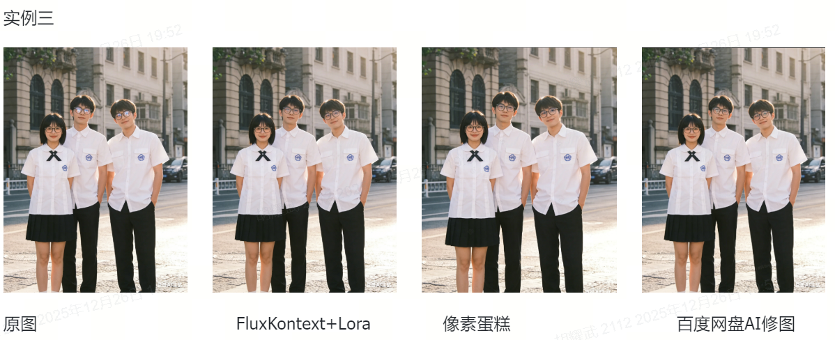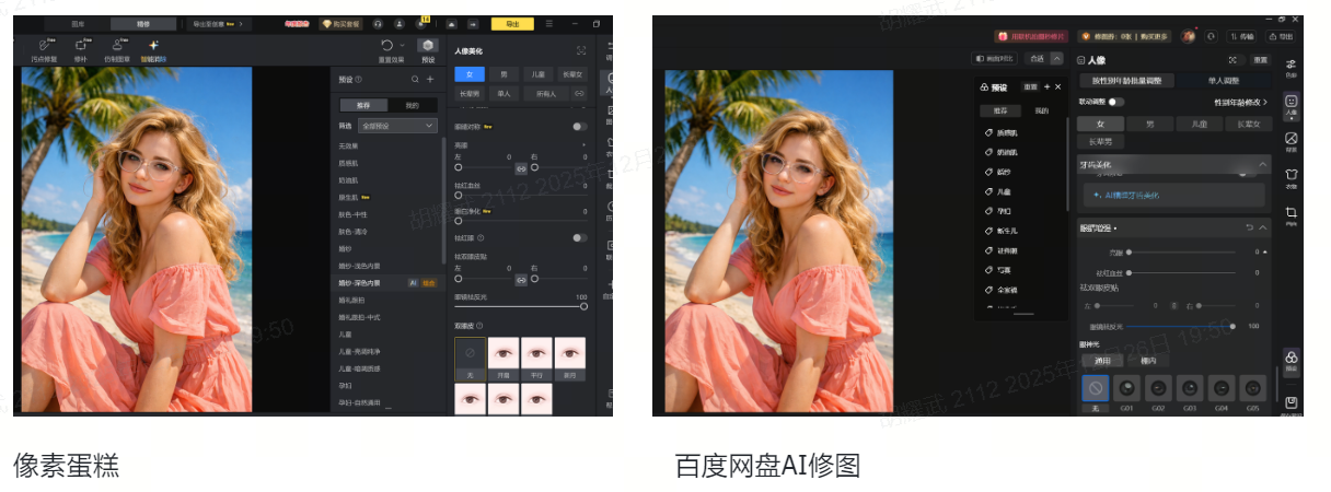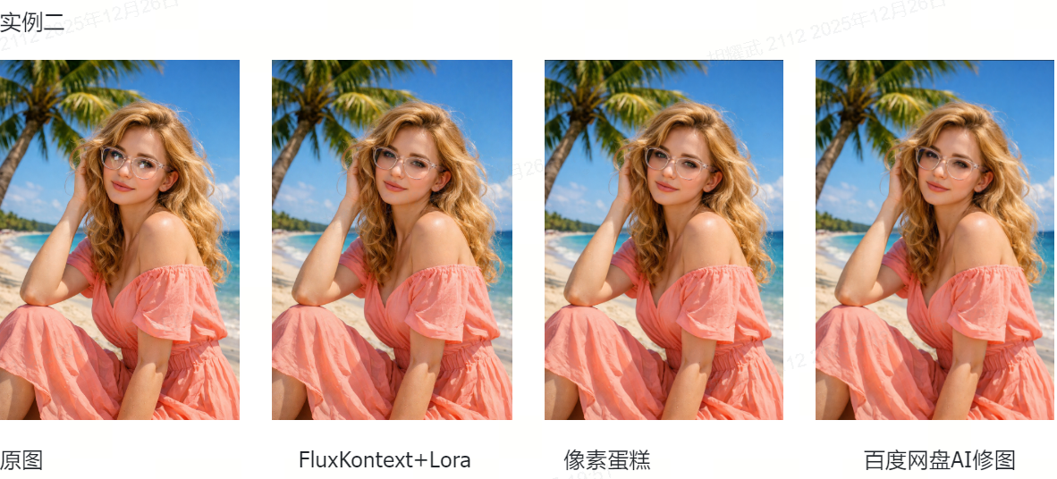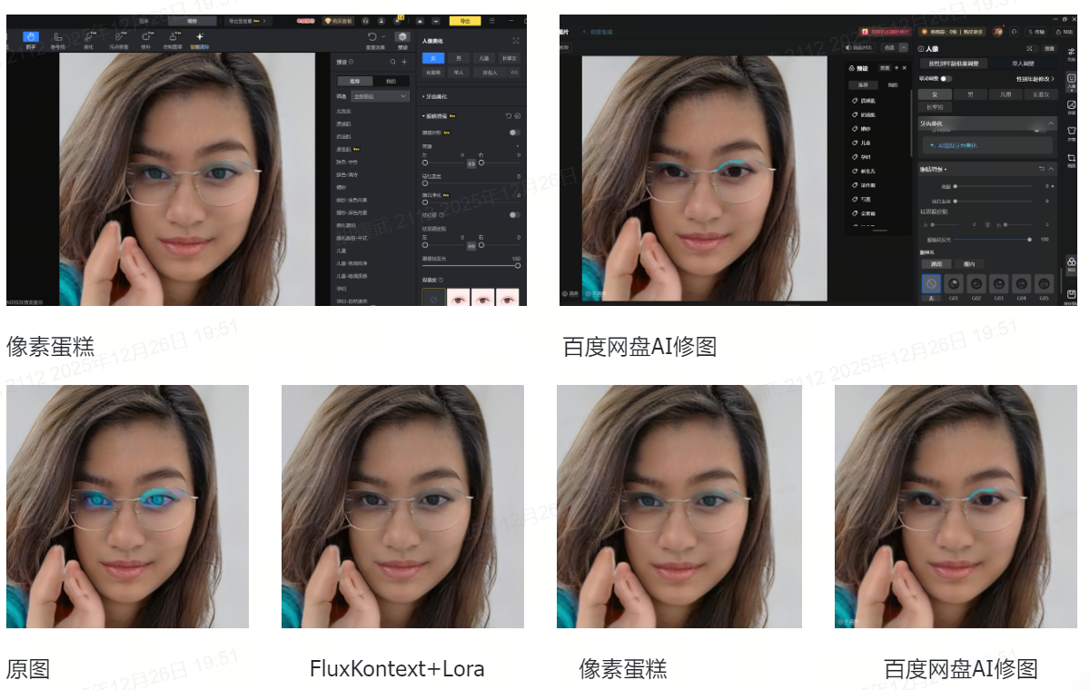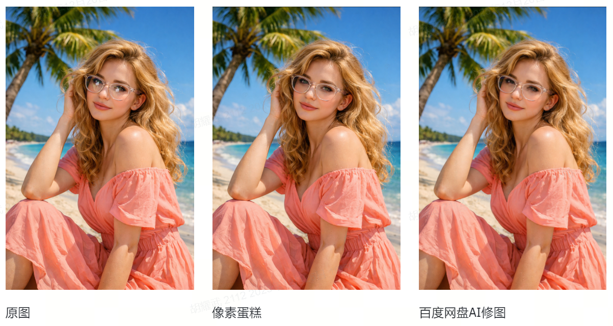 市面上像素蛋糕和百度网盘AI云修大概率都是基于GAN网络技术方案来构建的,对应效果举例如下图所示: