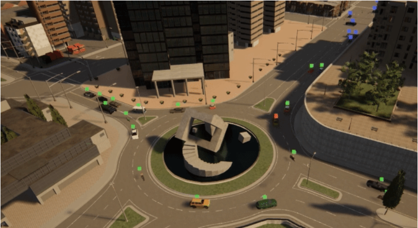 下图展示了混合模式激活时物理的启用/禁用状态:Hero 车辆标记为红色方框;物理禁用车辆标记为蓝色方框;进入 Hero 车辆影响半径后,物理启用,标记变为绿色。