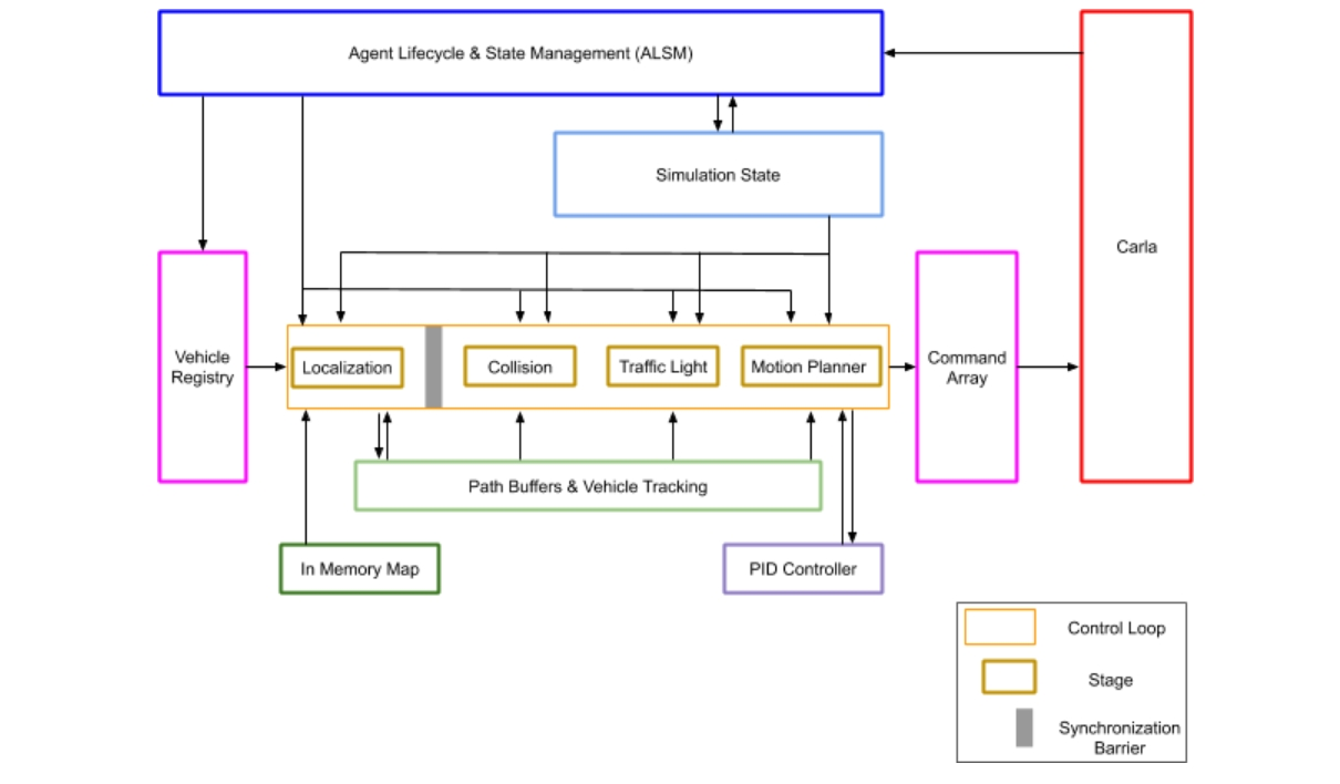 同步管理所有自动驾驶车辆的下一指令计算。包含五个阶段:定位、碰撞、交通灯、运动规划和车灯。