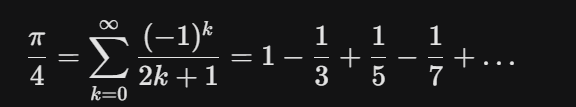莱布尼茨公式,作为 arctan(x) 的泰勒级数在 x=1时的特例,其数学表达为: