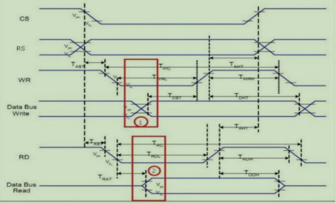 V_L)后,数据总线需提前输出有效数据(满足T_DSW,数据建立时间),且 WR 低电平需保持T_WC(写脉冲宽度),确保 LCD 稳定采样数据; - 后置要求:WR 拉高后,需保持