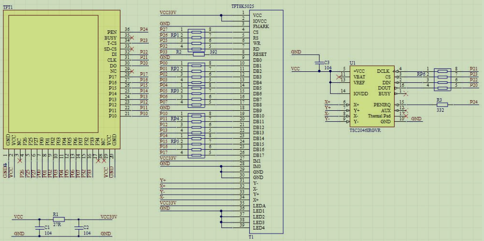 该原理图是TFTLCD 显示 + TSC2046 触摸控制的一体化硬件设计方案,适配嵌入式 MCU(如 STM32)的并行显示接口 + SPI 触摸接口,是嵌入式开发中典型的 "显示 + 触摸" 硬件架构