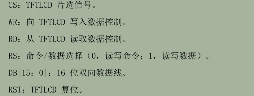 从图中可以看出,此 TFTLCD 模块采用16位的并行方式与外部连接,是因为彩屏的数量较大,16位比 8位 传输速度快