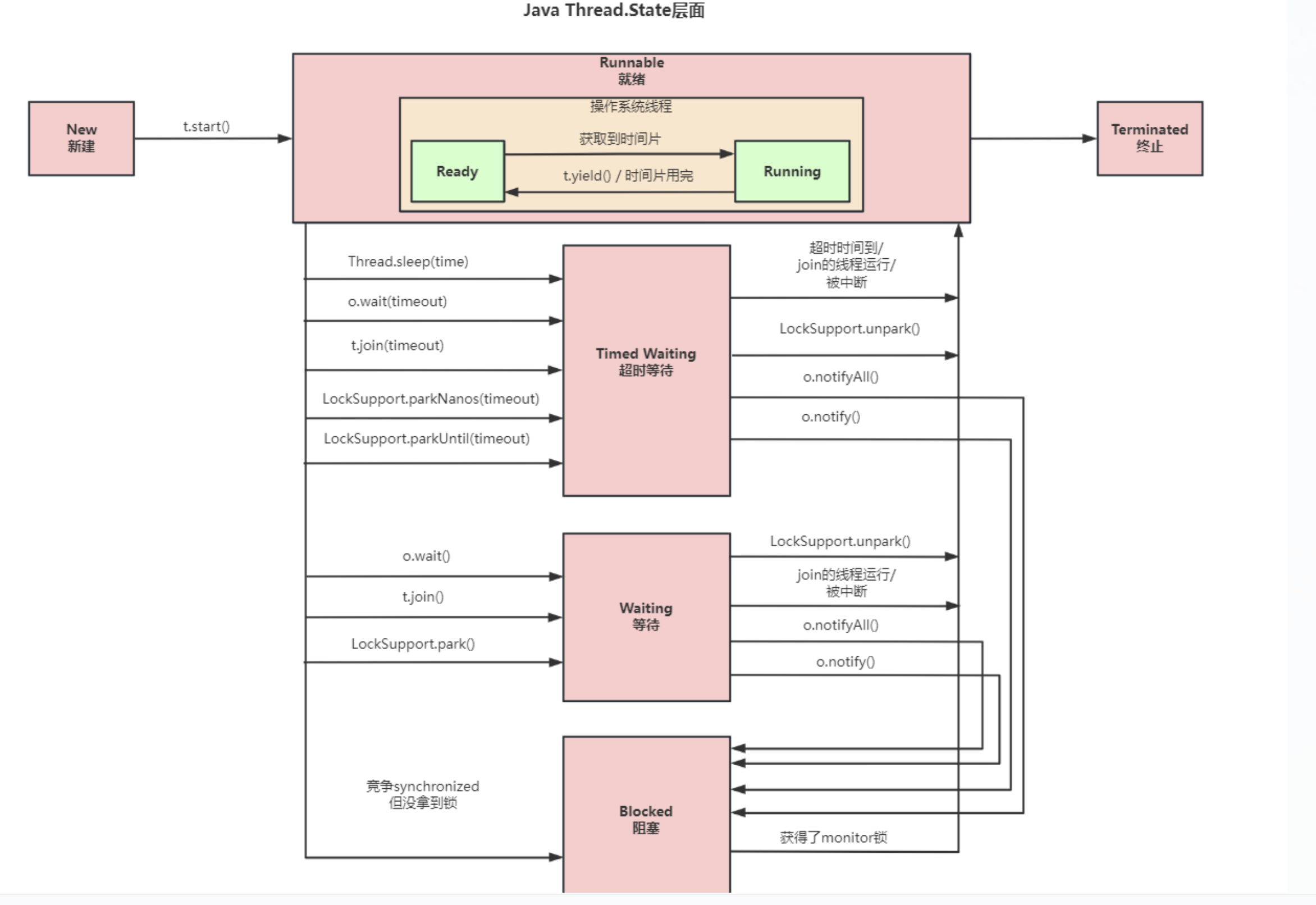 - 就绪状态(因为java无法感知是否获取时间片,就绪状态,运行状态是一个状态)