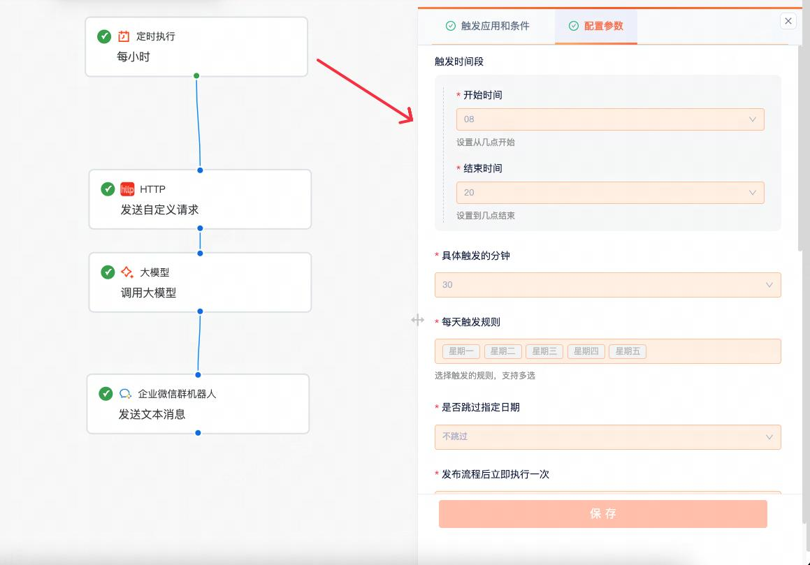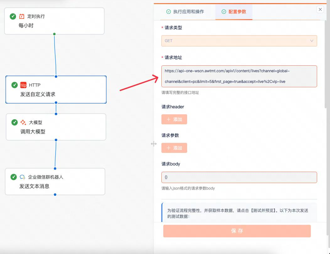 接下来,选择"HTTP应用"节点,输入需要请求数据的外部API的URL地址。平台支持GET、POST等多种常见请求方式,能适配绝大多数外部接口的对接需求。只需简单填写相关参数,系统就会按照设定的定时策略,自动向目标API发起请求,精准获取所需数据,无需手动调用查询。