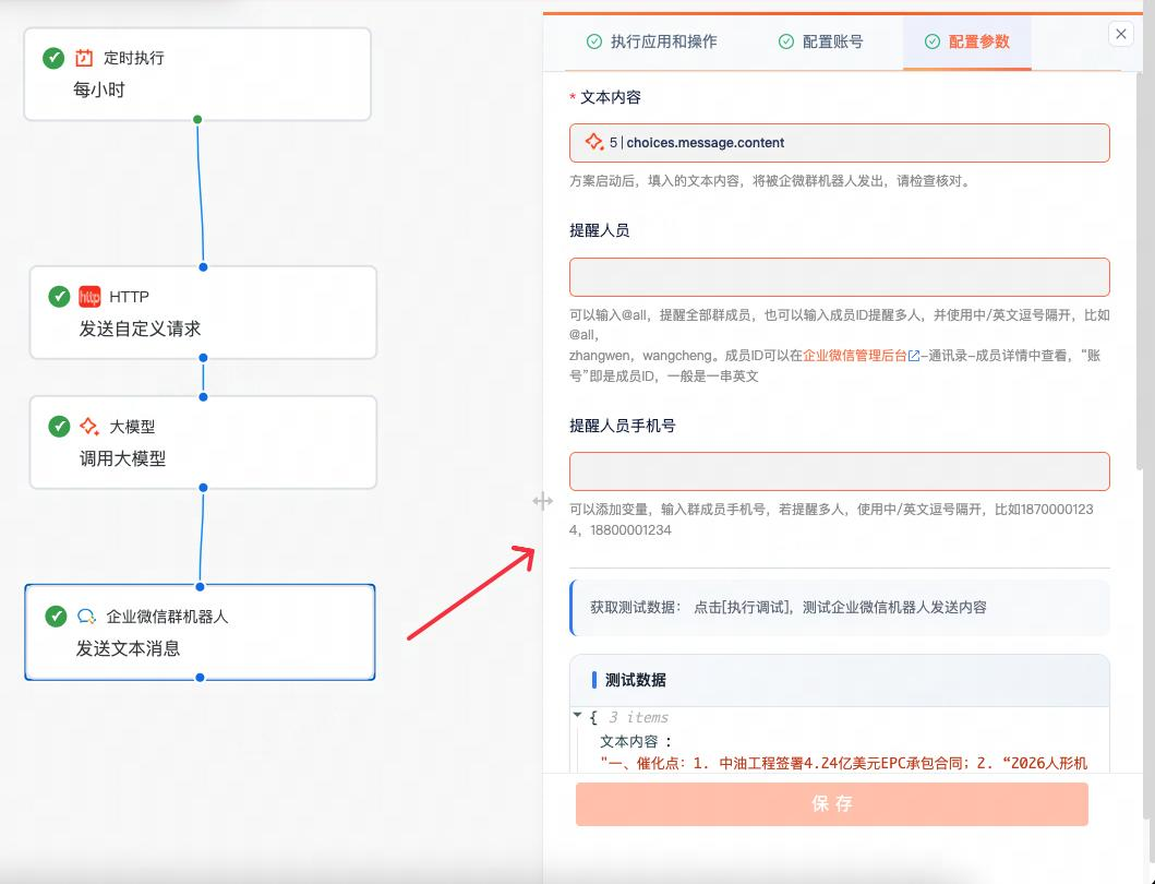 数据获取完成后,选择"发送企业微信群机器人应用"节点,完成企业微信群机器人的关联配置。发送内容支持普通文本、富文本等多种格式,更便捷的是,你可以直接将上一步HTTP请求获取到的数据作为发送内容,无需二次编辑整理。无论是关键业务数据、系统告警信息,还是外部动态数据,都能精准、清晰地推送到指定企业微信群。