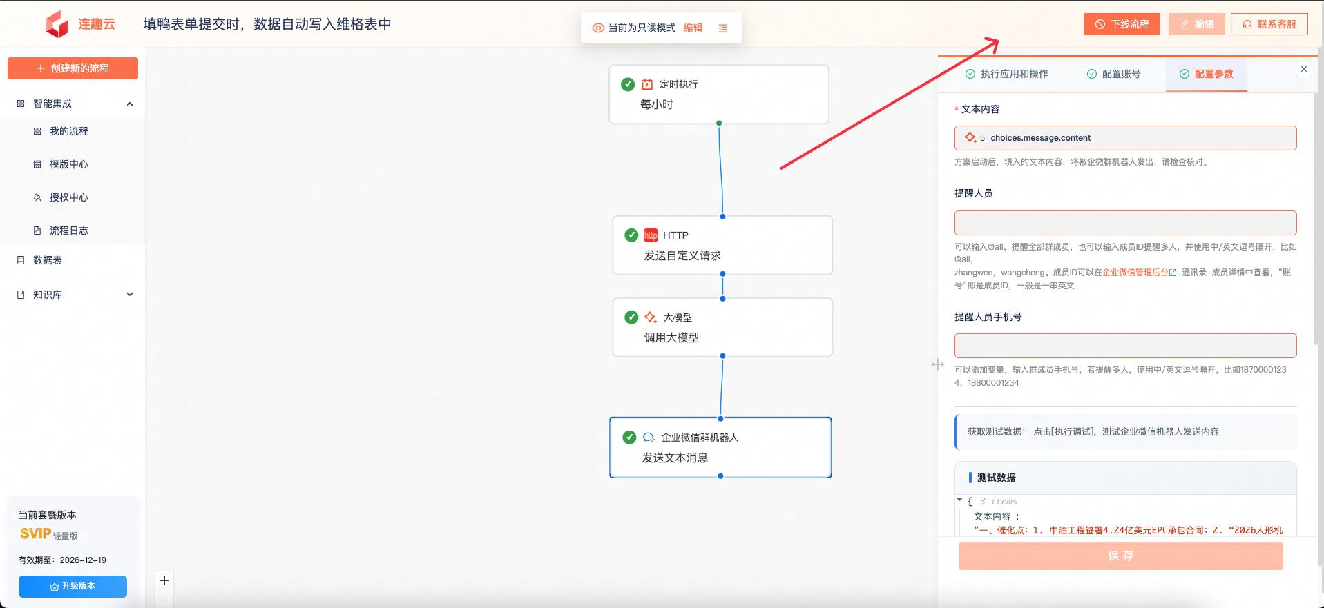 所有配置完成后,只需点击"上线流程",整个自动化流程就正式启动。系统将按照设定的定时策略,自动完成API数据查询、数据推送全流程,后续无需人工干预,数据会准时出现在企业微信群中,让团队成员第一时间获取关键信息。
