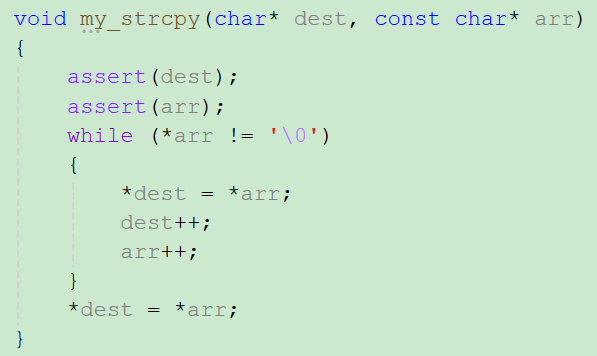 自己实现的my_strcpy函数,返回类型是void是可以的,只是把一个数组的内容复制到另外一个数组那,后面再讲;先把两个数组的指针作为参数,assert断言两个都不是空指针,对原有数据的数组遍历一遍放到另一个数组中,直到遇见\0停止,循环结束后,两个数组的地址都指向了\0,最后再把\0放过去;