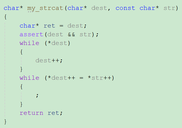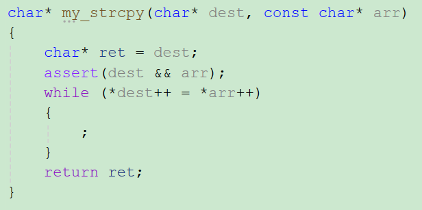 - 为什么*dest++=*arr++ 放在while循环里面呢?因为这个表达式就是赋值的结果,给的是'a',结果就是'a',如果一直加加,赋值,给的是'\0',那就循环结束了。