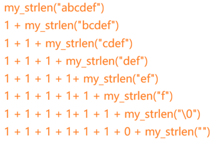 - 1 + my_strlen("bcdef") 把一个一个问题拆分,不断取出一个个字符,不断+1