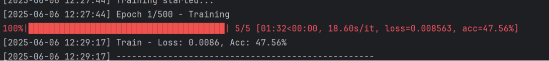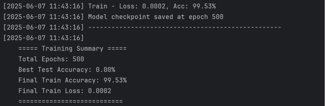 2)训练时,刚开始训练了10轮,准确率不高,通过增加训练轮次至 500 轮,模型有足够迭代次数学习数据特征,解决了初始 10 轮的欠拟合问题,提升准确率。