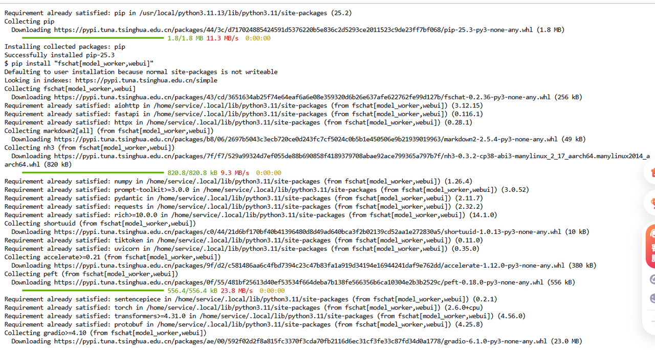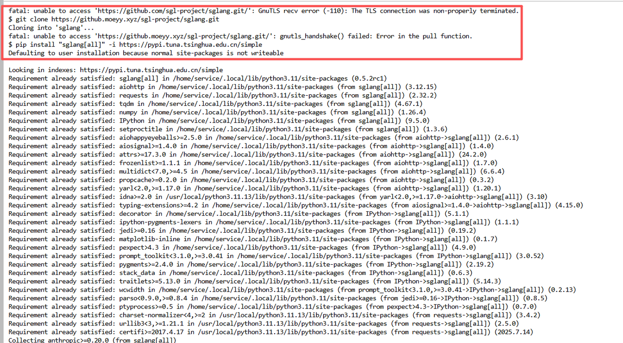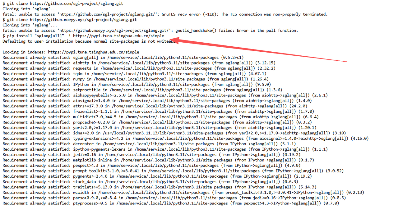 直接从清华源安装 sglang # "[all]" 会自动安装所有依赖,包括 backend pip install "sglang[all]" -i https://pypi.tuna.tsinghua.edu.cn/simple