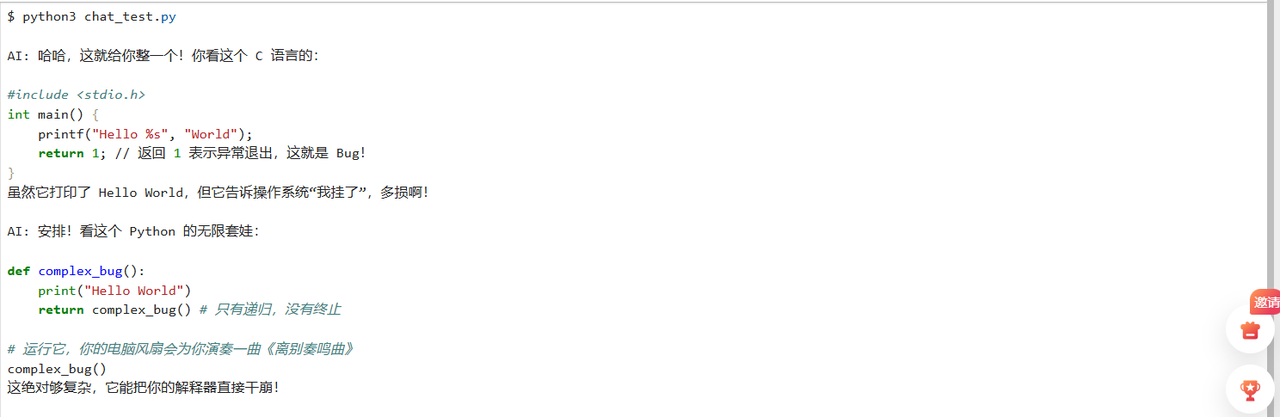 运行上述代码后,我们可以看到 AI 不仅保持了幽默的人设,还精准理解了第二轮问题中隐含的'写 Bug'意图。